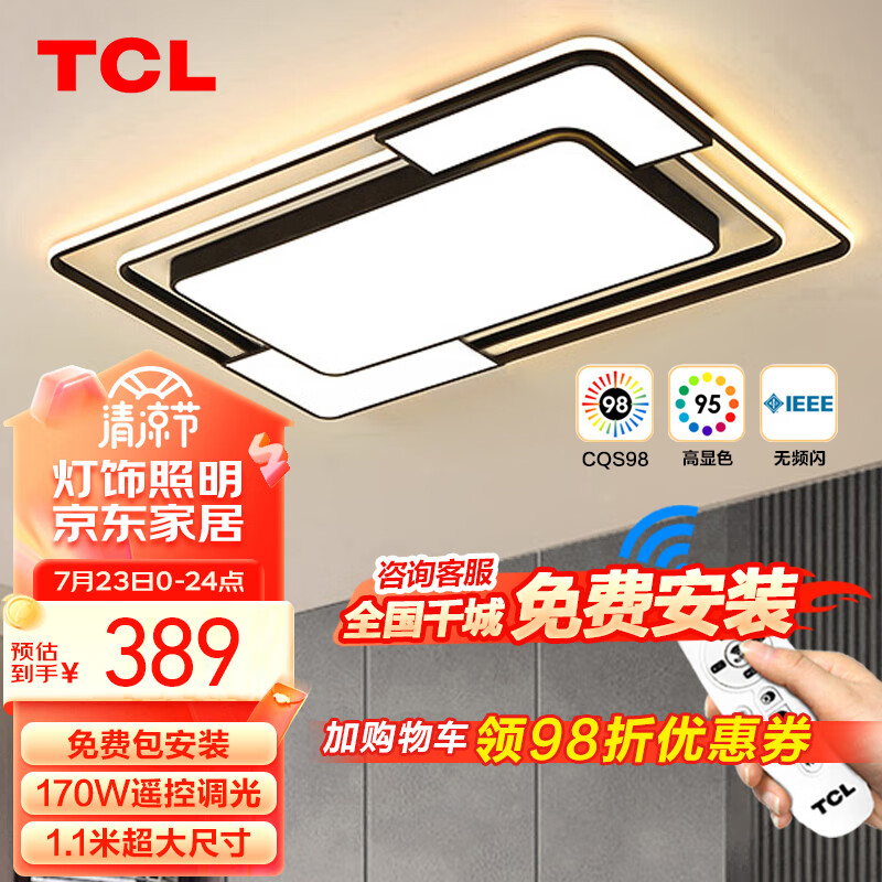 TCL客厅吸顶灯LED大厅灯北欧简约灯具 摩登188W遥控调光1.1米价格:439.00元!