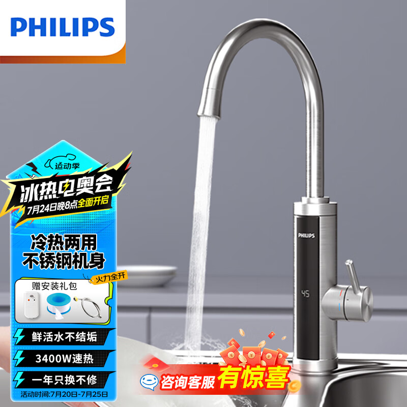 飞利浦(PHILIPS)电热水龙头 不锈钢机身厨房即热式小厨宝速热水龙头加热快速热电热水器AWH1022SS/93价格:299.00元!