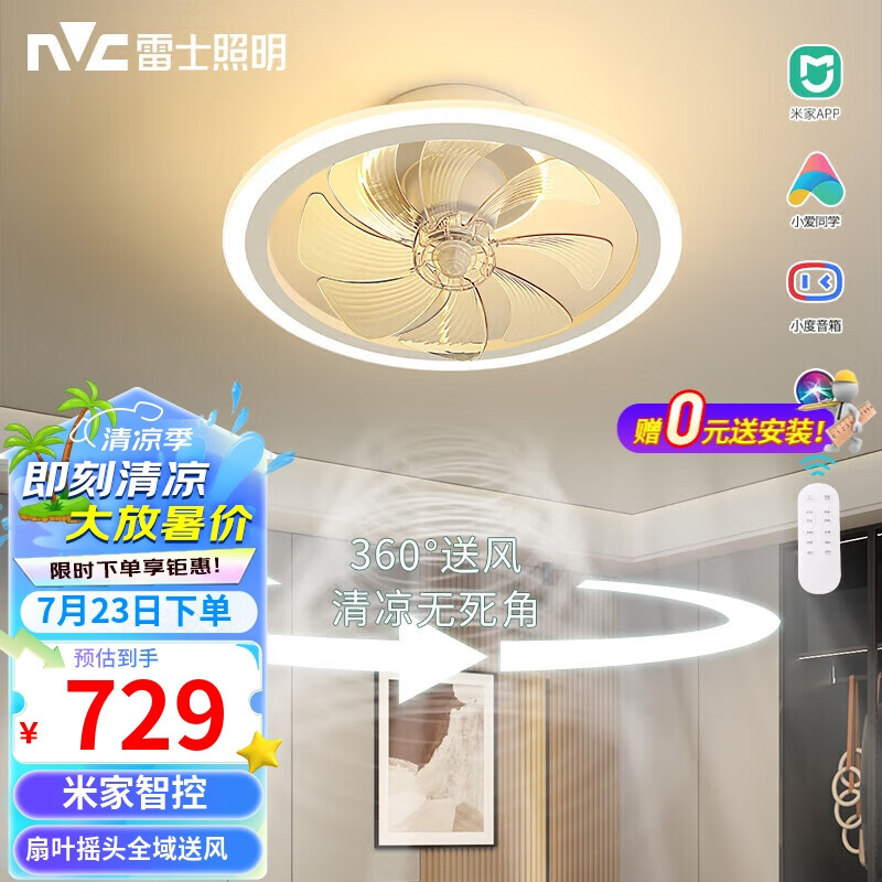雷士(NVC)吸顶风扇灯吊扇灯卧室米家智控摇头语音无极调光调色定时关机36瓦价格:809.00元!