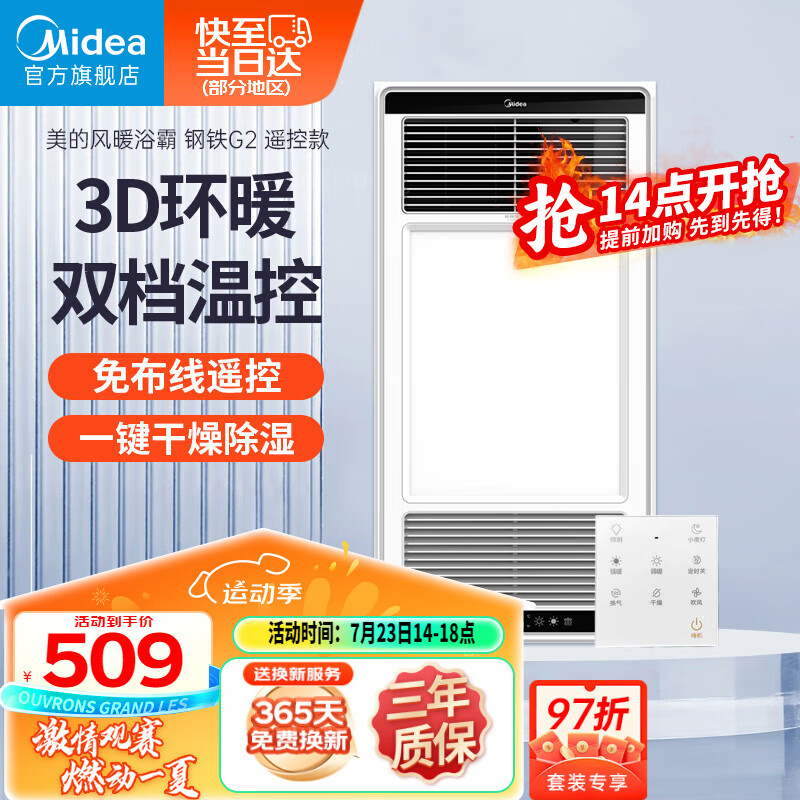 美的(Midea)浴霸风暖集成吊顶多功能排气扇照明一体浴室卫生间无线遥控取暖器价格:599.00元!