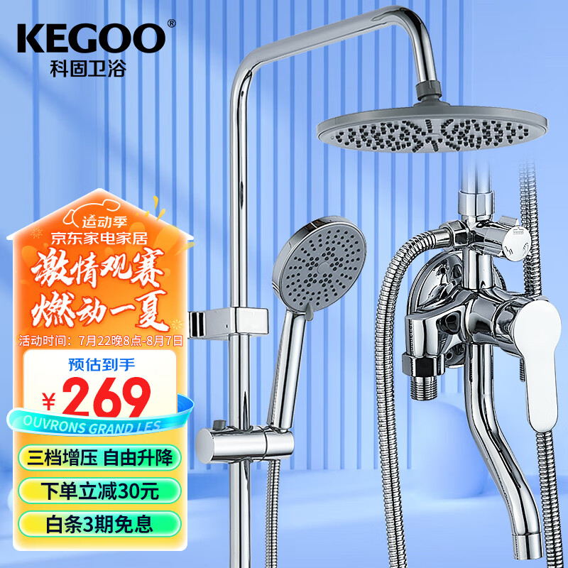 科固(KEGOO)花洒全套明装淋浴器喷头套装 明管混水阀洗澡水龙头沐浴开关K4015价格:299.00元!