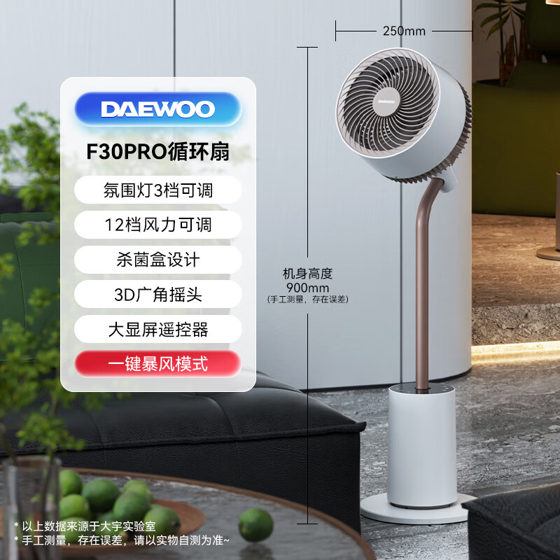 大宇(DAEWOO)【落地氛围灯】杀菌空气循环扇12档立式电风扇轻柔音直流变频柔风小型落地空调扇F30PRO白价格:759.00元!