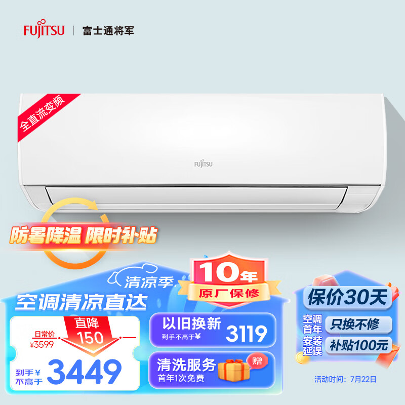 富士通 11-15㎡适用 新2级能效 1匹 全直流变频挂机 以旧换新挂机 省电空调ASQG09LGCB (KFR-25GW/Bpgb)价格:3449.00元!
