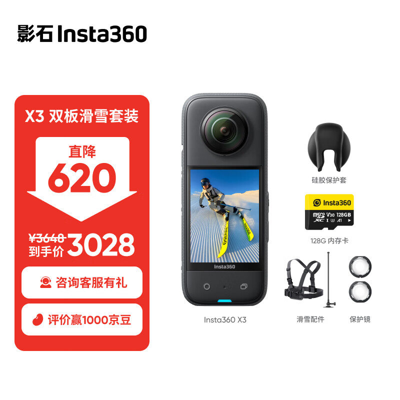 Insta360影石 X3全景运动相机防抖防水摄像机5.7K高清Vlog摩托车骑行滑雪潜水路亚(双板滑雪套装)价格:3028.00元!