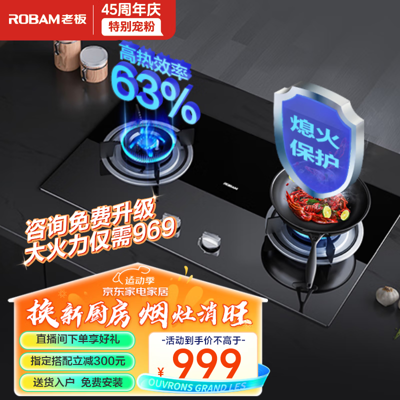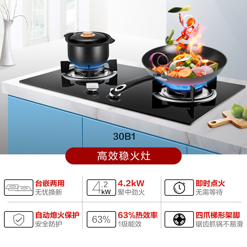 老板(Robam)燃气灶天然气灶双灶 4.2kW家用嵌入式钢化玻璃灶具灶台 一级能效台嵌两用 换灶选老板JZT-30B1价格:999.00元!