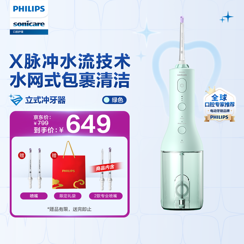 飞利浦家用立式冲牙器 七夕礼物送男/女友礼物 立式手持2种洁齿模式3级洁齿力度美牙舱HX3826/34 绿色价格:729.00元!