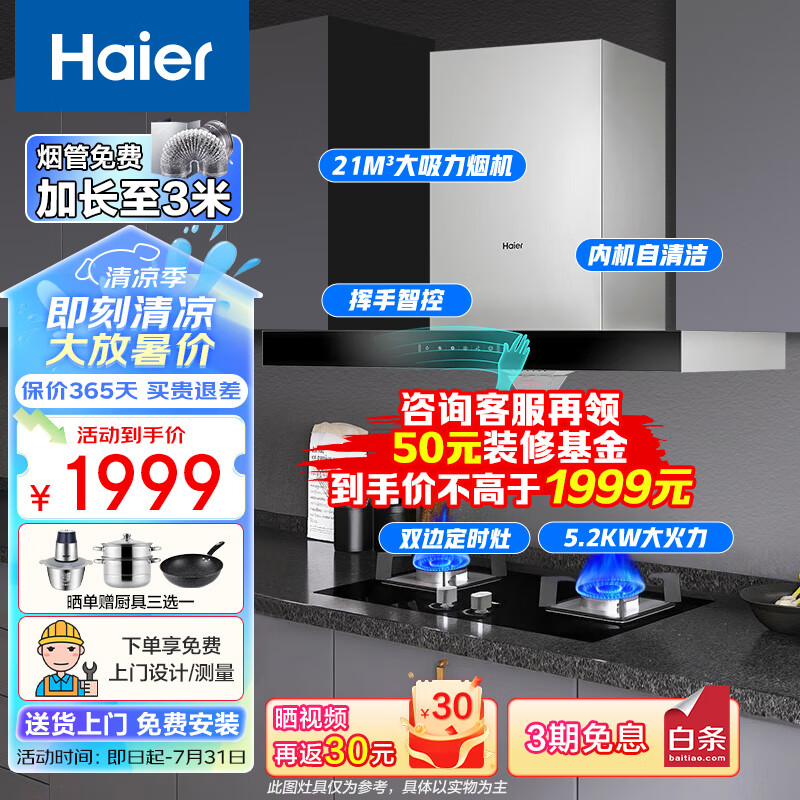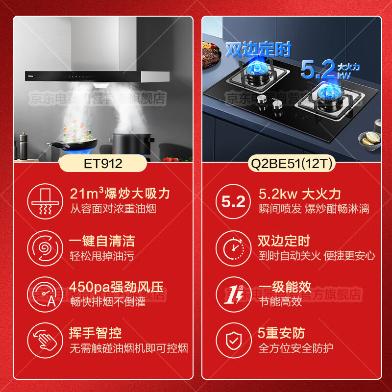 海尔(Haier)抽油烟机燃气灶套装 欧式顶吸自清洁挥手开关 21m3大吸力吸油烟机家用ET912烟灶套装5.2KW灶[家电]价格:2149.00元!