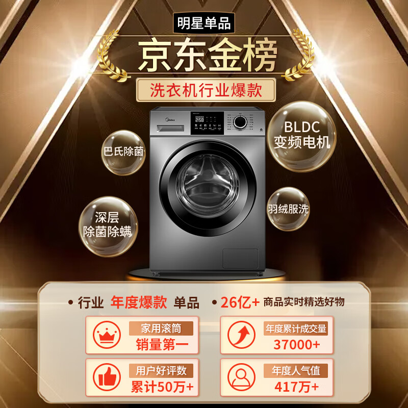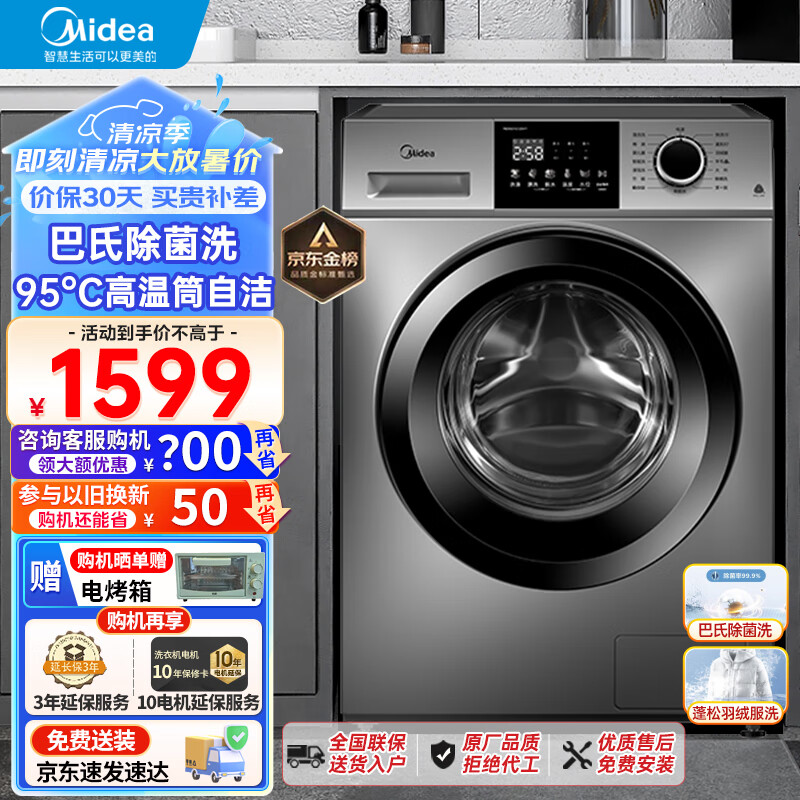 美的(Midea)滚筒洗衣机全自动10公斤大容量 一级变频节能 巴氏除菌洗 WIFI智控 除菌除螨 MG100VC133WY价格:1599.00元!