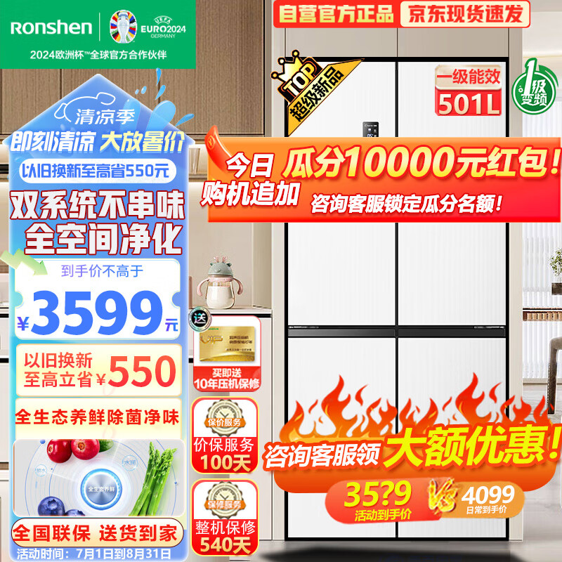 容声(Ronshen)501升冰箱四开门十字对开独立双系统循环不串味一级风冷变频全空间净化蓝光养鲜BCD-501WD18FP白价格:4099.00元!