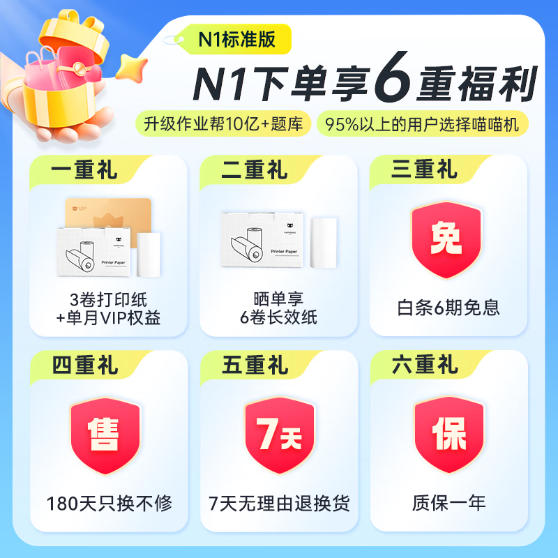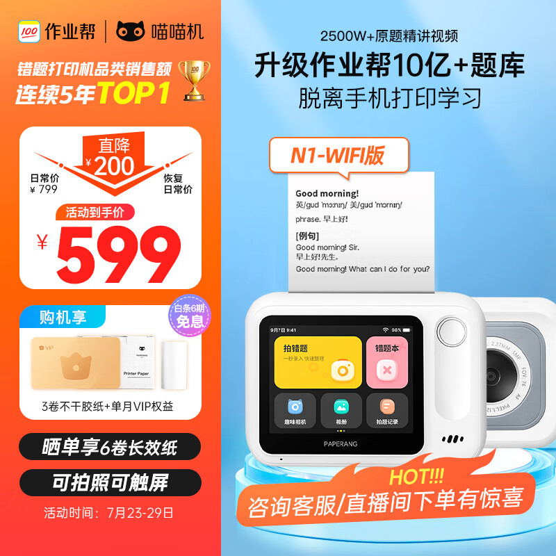 喵喵机N1 高清灰阶作业帮学生错题整理神器家用迷你热敏脱离手机可触屏智能学习错题打印机 WIFI版价格:599.00元!