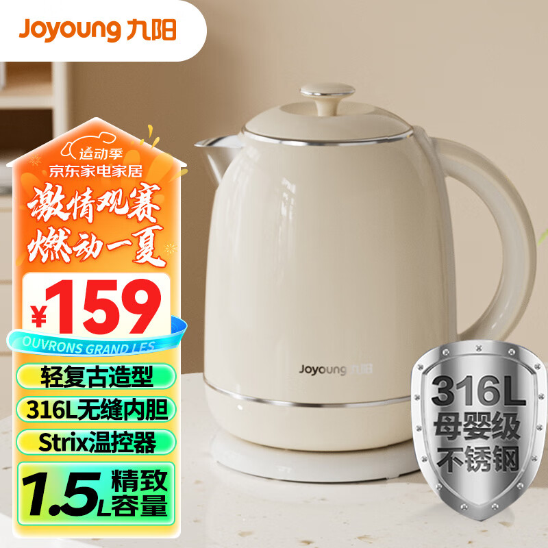 九阳(Joyoung)热水壶烧水壶电水壶1.5L 双层隔热316L不锈钢无缝内胆 轻复古家用开水壶K15FD-W582价格:159.00元!