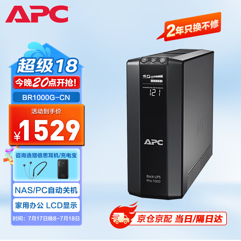 APC施耐德ups不间断电源BR1000G-CN 600W/1KVA nas电脑网络设备商务办公停电稳压应急备用ups电源价格:1529.00元!