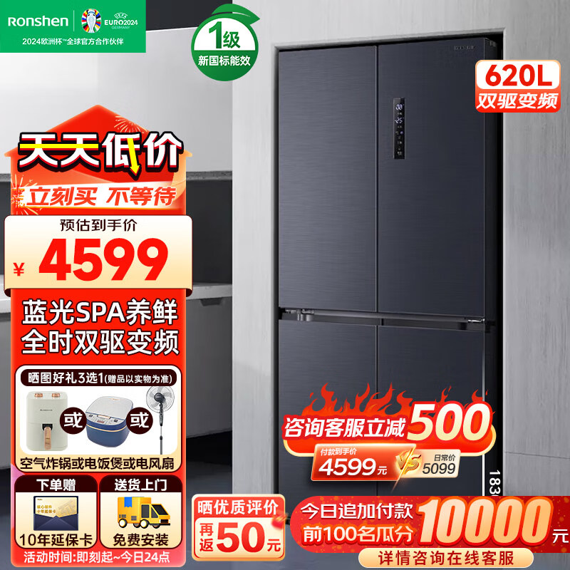 容声(Ronshen)620L十字对开四门大容量一级能效蓝光养鲜超薄变频风冷无霜冰箱BCD-620WD19FP价格:4799.00元!
