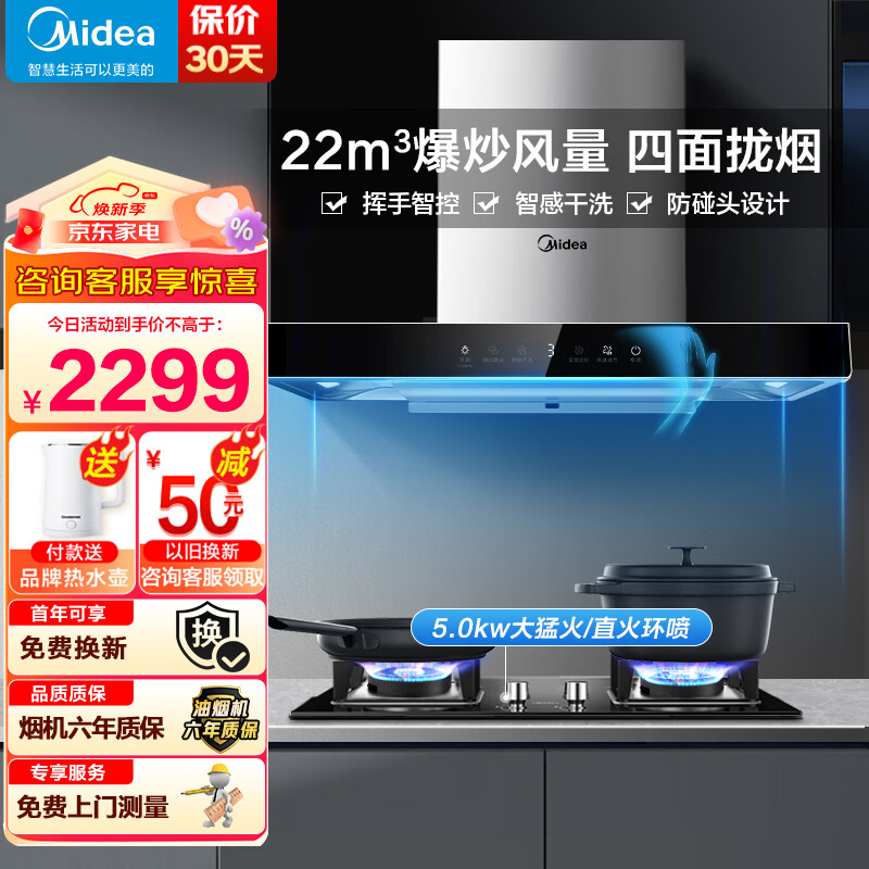 美的(Midea)欧式顶吸抽油烟机家用22立方大吸力吸油烟机燃气灶具两件套装天然气厨房电器以旧换新TN306+Q330价格:2299.00元!
