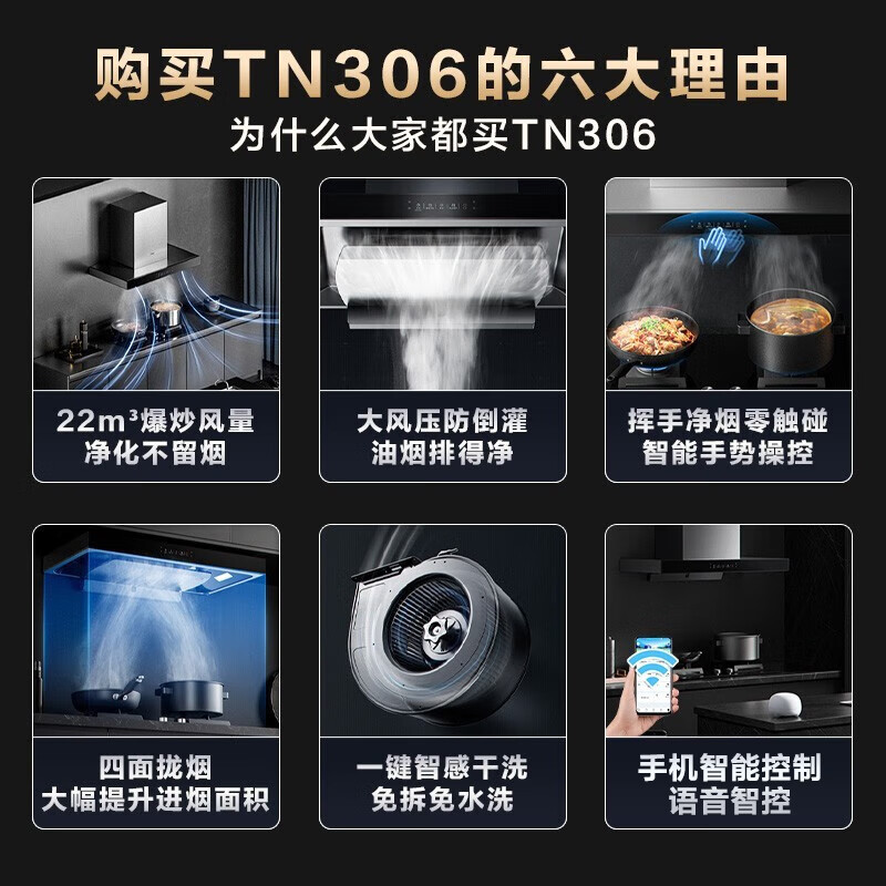 4、美的(Midea)欧式顶吸抽油烟机家用22立方大吸力挥手控制自动清洗APP智能厨房家电TN306与燃气灶比较匹配,货到后安装也很快,很满意。