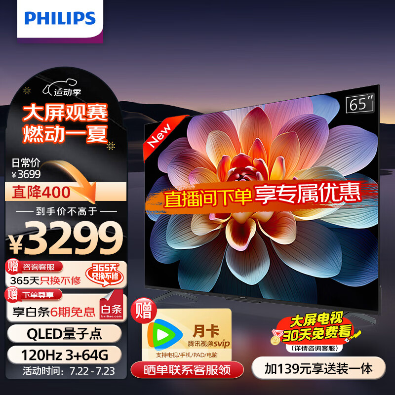 飞利浦(PHILIPS)65英寸 4K超高清智慧屏 QLED量子点120Hz 3+64G 远场AI语音 液晶平板电视机 65PQF8599/T3价格:3299.00元!