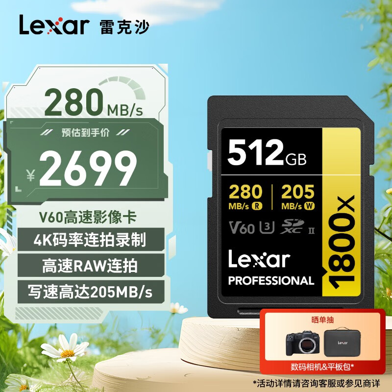 雷克沙(Lexar)512GB SD存储卡 C10 U3 V60 数码相机高速内存卡 读280MB/s 写205MB/s 4K畅拍(1800x)价格:2699.00元!