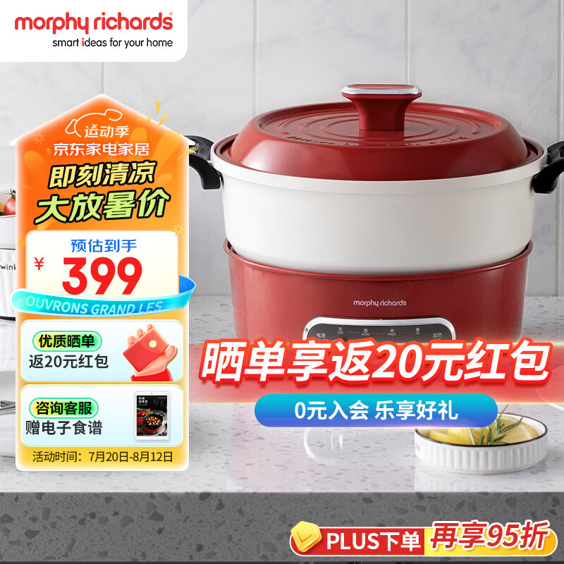 摩飞电器(Morphyrichards)电火锅 家用分体式电煮锅 烤涮一体多功能电炒锅电烧烤料理锅 3L电热火锅锅 MR9087 英石红价格:399.00元!