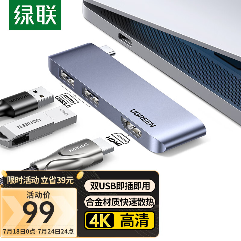 绿联(UGREEN)Type-C扩展坞USB-C转HDMI高清4K投屏转换器多个USB分线器直插式拓展坞适用苹果MacBook笔记本平板价格:138.00元!