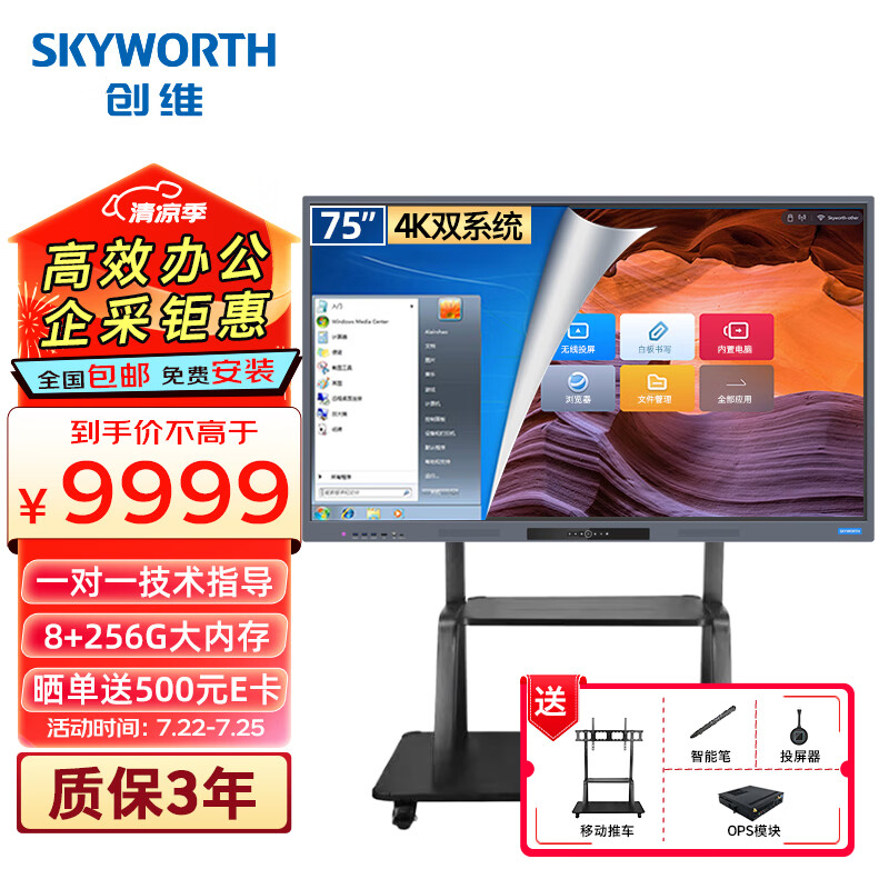 创维(Skyworth)75英寸会议平板智能一体机电子白板无线同屏教育培训触摸电视双系统75DSH5推车+投屏器商用显示价格:9999.00元!
