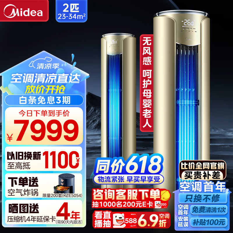 美的(Midea)舒适星无风感空调 新一级全直流变频 智能立式柜机客厅圆柱 KFR-51LW/BDN8Y-YB305(1)A价格:7999.00元!