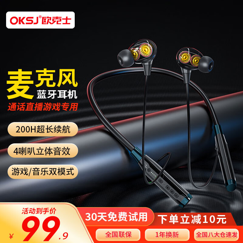 OKSJ挂脖式蓝牙耳机运动跑步颈挂式无线超长续航 大电量双耳入耳式磁吸ENC通话降噪防水汗【四喇叭】价格:96.00元!
