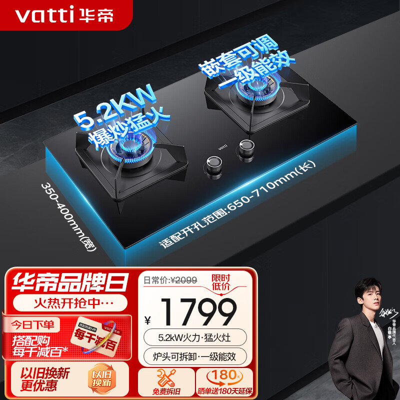 华帝(VATTI)燃气灶 煤气灶 嵌入式台式双灶具灶台 华帝官方一级能效 可调节开孔尺寸 5.2kW猛火灶-75B-天然气价格:1499.00元!