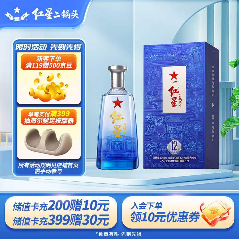 红星二锅头蓝盒12 清香型白酒 43度 500ml 单瓶装送礼价格:128.00元!
