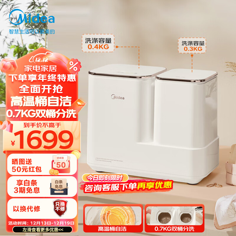 美的(Midea)0.7公斤内衣洗衣机全自动分区双桶洗漂脱 双动力电机护衣 高温银离子除菌除螨洗袜子内衣MNB7VA0E价格:1699.00元!