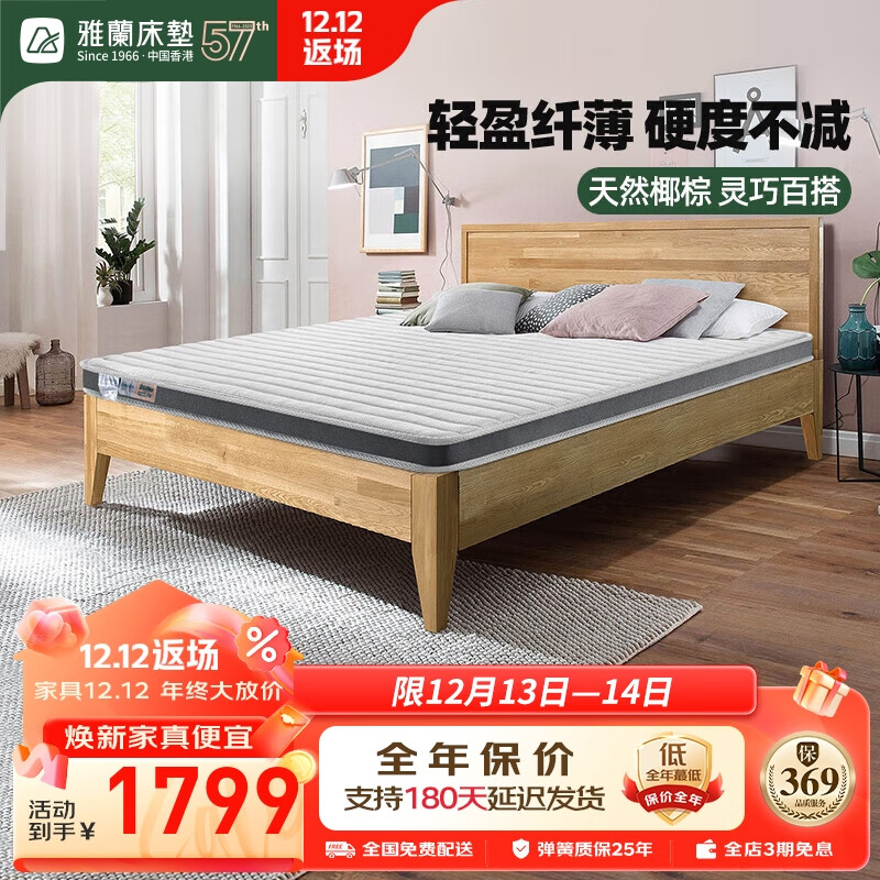 雅兰椰棕床垫学生薄床垫宿舍床垫 硬核乳胶椰棕款【10cm】1.5*1.9米价格:2099.00元!
