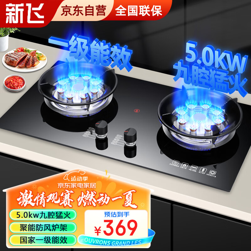 新飞家用燃气灶液化气双灶玻璃5.0KW一级能效嵌入式台式灶煤气灶聚能猛火双九腔纯铜炉具JZY-A3价格:369.00元!