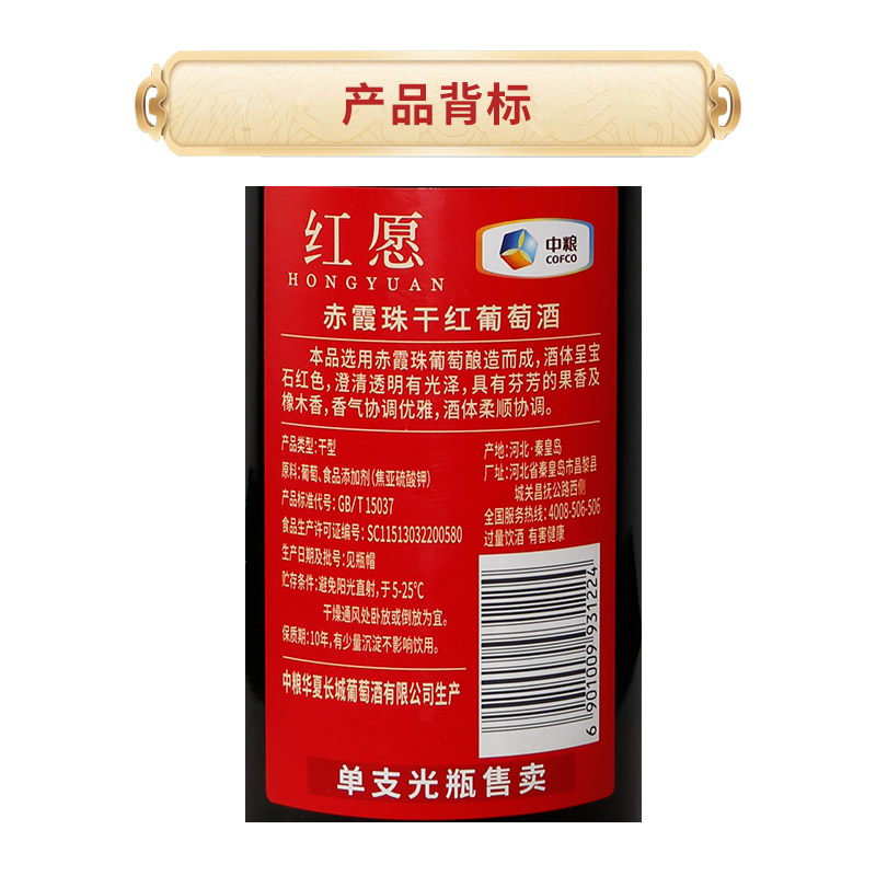 商品名称:长城红愿赤霞珠干红葡萄酒