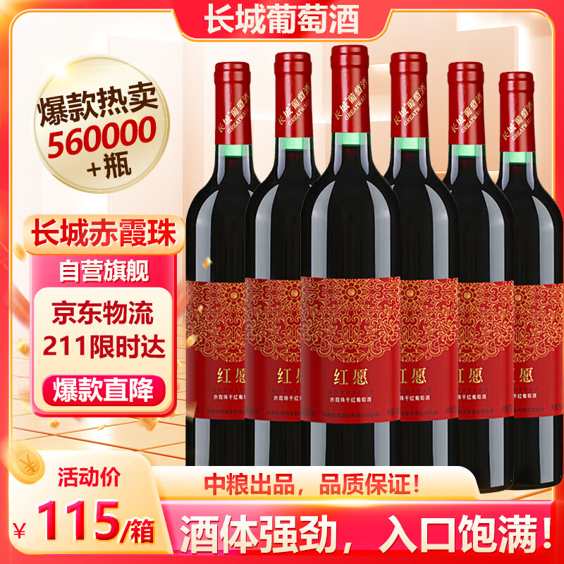 长城(GreatWall)红酒 中粮出品 赤霞珠干红葡萄酒750ML*6瓶整箱装(原箱包装)价格:115.00元!