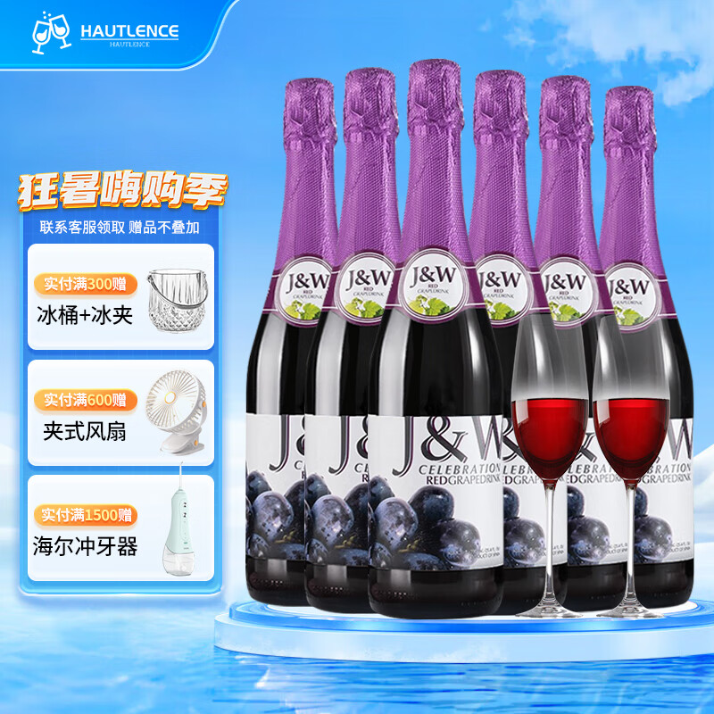 艾加(JW)无醇无酒精起泡酒葡萄酒香槟瓶型葡萄汁0度气泡酒女神节礼物 红葡萄6*750ml整箱装价格:299.00元!