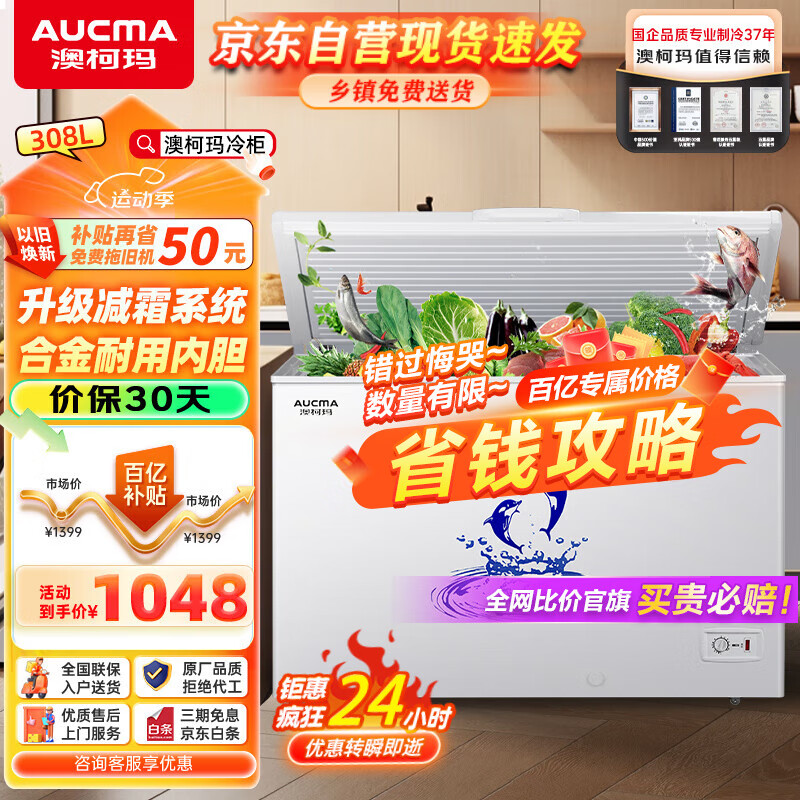 澳柯玛(AUCMA)308升阻霜卧式商用家用冰柜 商用大容量 冷藏柜大冷冻柜冰柜家用冰箱大冷柜以旧换新 BC/BD-308HNE 308L价格:1049.00元!