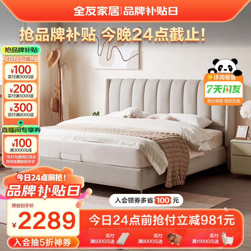 全友家居 床现代简约科技布床双人床主卧室1.8米舒适软靠家具105207CK价格:3270.00元!