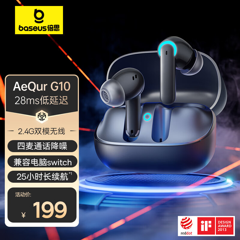 倍思 G10 真无线蓝牙耳机 25ms游戏低延迟2.4G双模 长续航通话降噪入耳 电脑电竞吃鸡 适用华为小米 黑价格:329.00元!