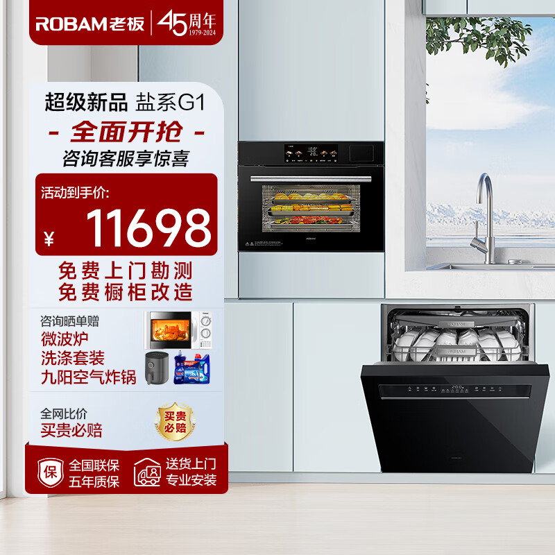老板(Robam)盐系G1火山盐黑洗碗机蒸烤套系自动开关门免费橱改55L搪瓷EXP专业控温价格:11698.00元!