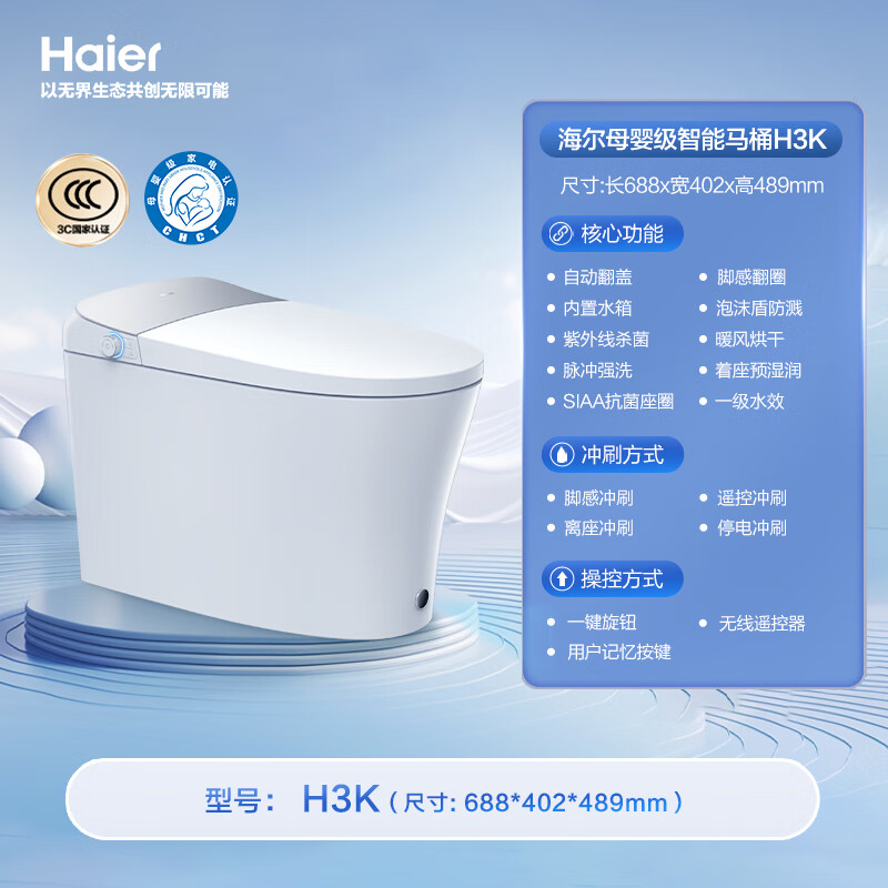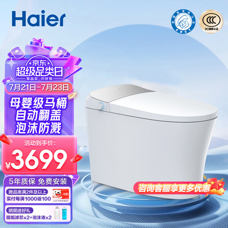 海尔(Haier)母婴级智能马桶 自动翻盖翻圈 泡沫盾杀菌全自动坐便器H3K-D730价格:4199.00元!