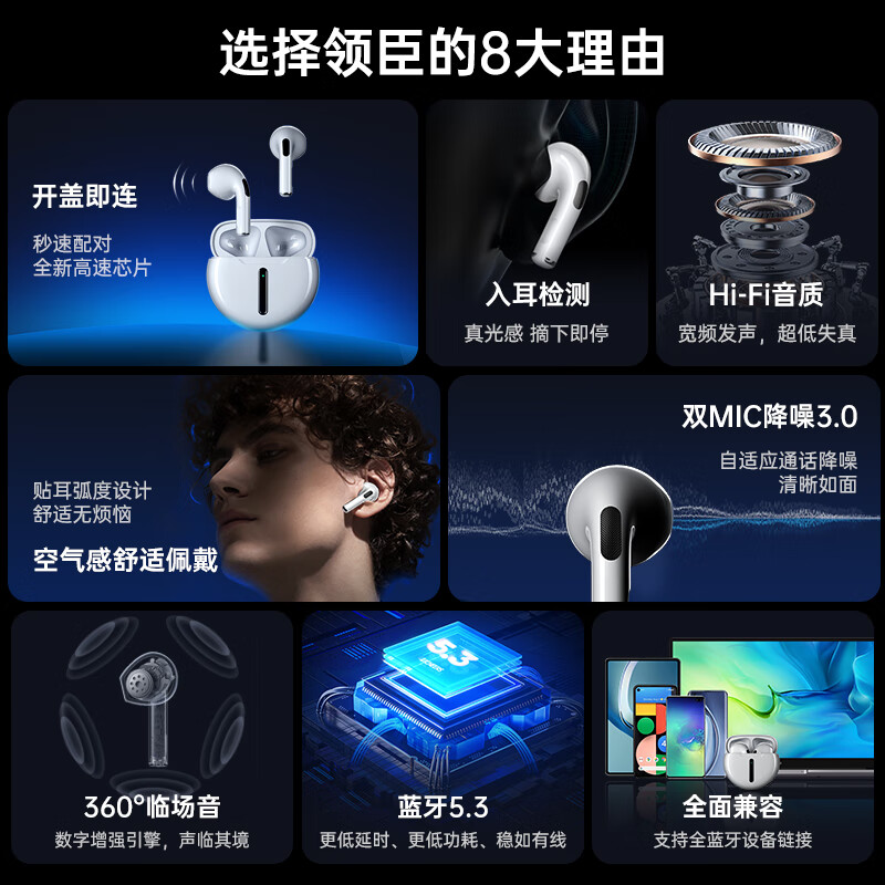 领臣适用华为蓝牙耳机无线p60p50p40p30nova10/9/8/7/6mate50pro荣耀oppo小米vivo鸿蒙通用降噪半入耳价格:129.00元!