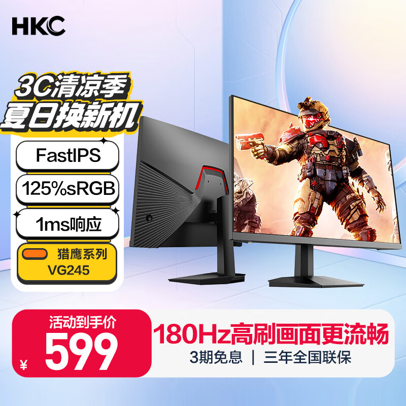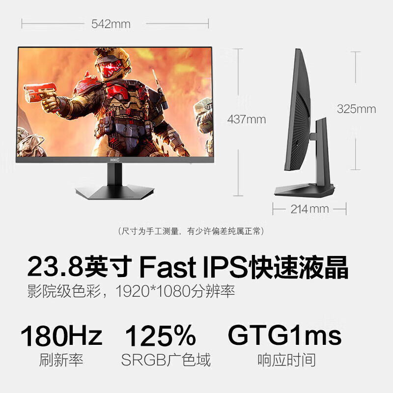 HKC 23.8英寸180Hz高刷FastIPS快速液晶125%sRGB广色域300nit高清1ms小金刚电竞游戏显示器 猎鹰VG245价格:649.00元!