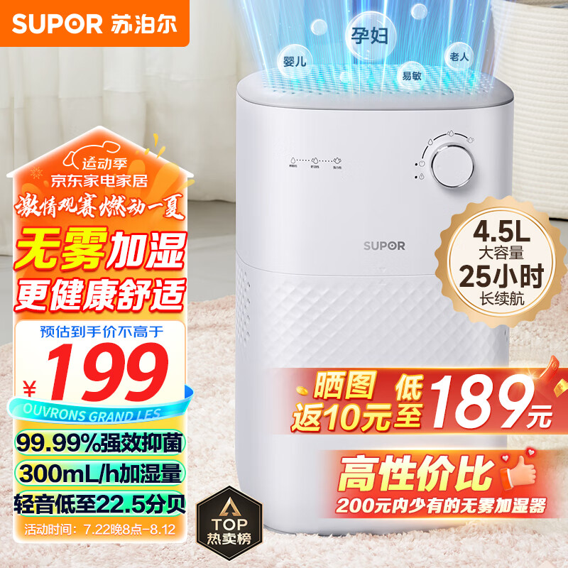 苏泊尔(SUPOR)无雾加湿器4.5L卧室家用桌面大容量婴儿孕妇轻音除菌空气加湿器空气净化空调伴侣EHTN-06A价格:199.00元!