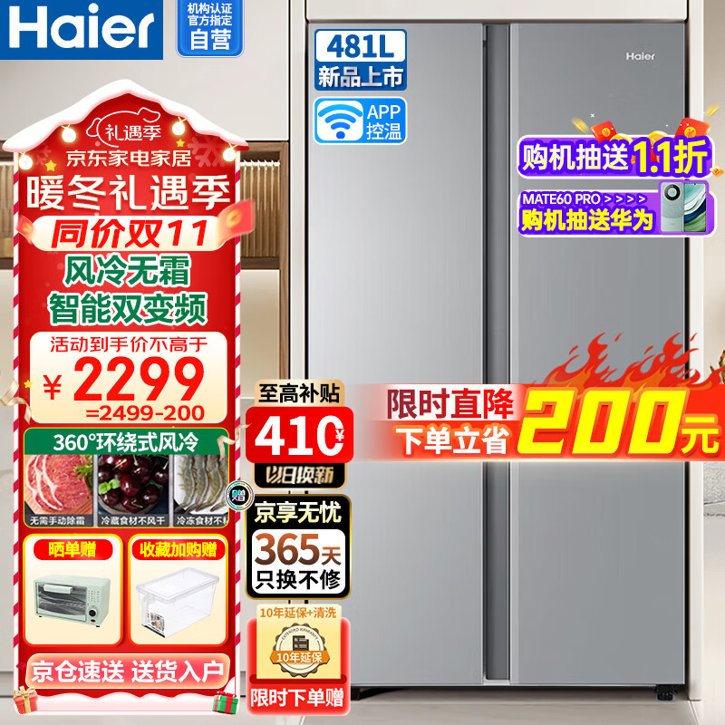 海尔(Haier)冰箱481升对开门双开门大容量风冷无霜节能双变频大冷冻力WIFI控温家用电冰箱BCD-481WGHSSEDS9U1价格:2297.00元!