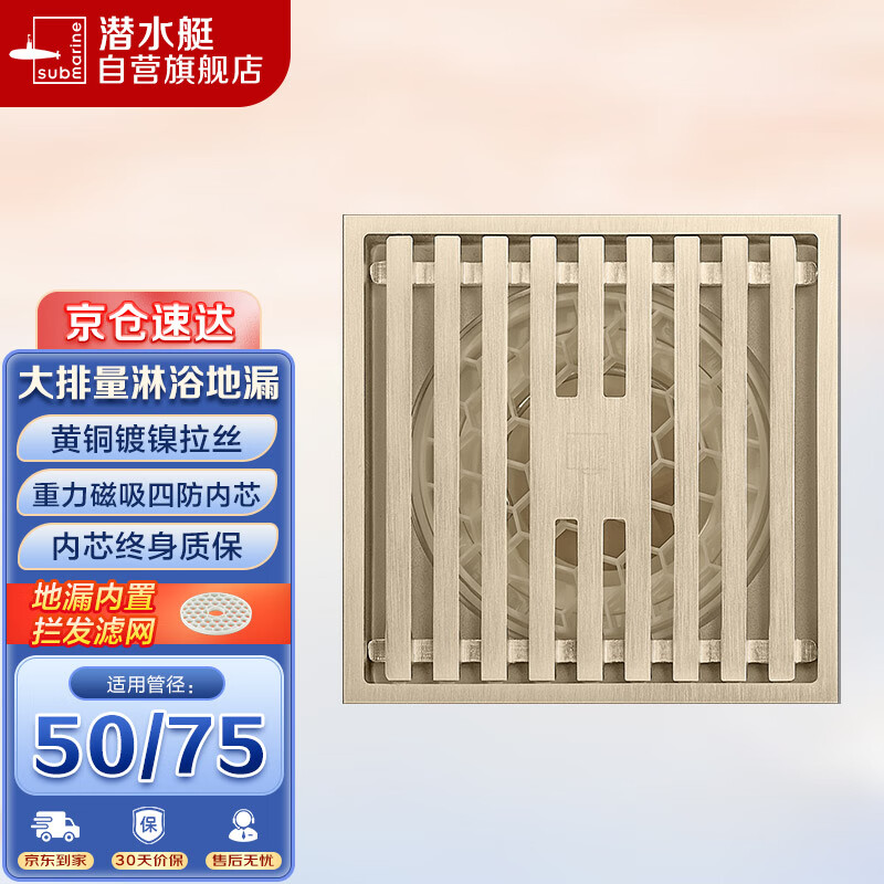潜水艇(Submarine)LTK50-10大排量防臭地漏铜镀镍 奶油风 淋浴四防地漏50管径价格:128.00元!