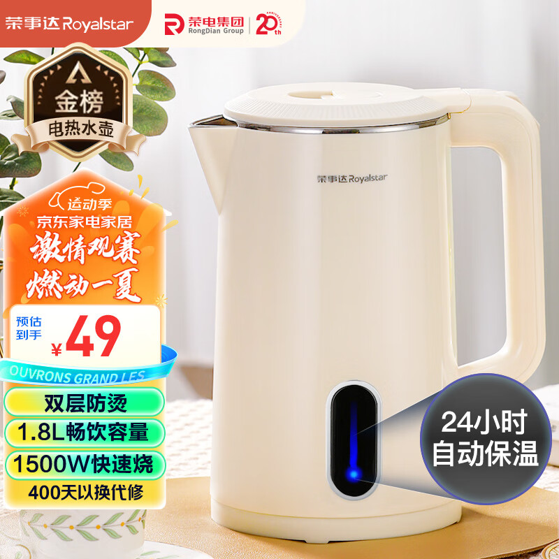 荣事达(Royalstar)电热水壶电水壶烧水壶暖水壶开水壶家用办公室保温304不锈钢大功率1.8升快速烧水电水壶RS-KT18G价格:49.00元!
