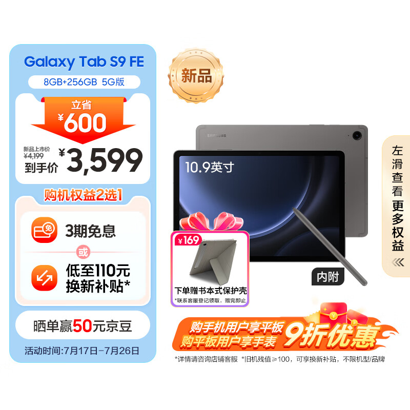 三星(SAMSUNG) S9 FE 2023款平板电脑 10.9英寸 8+256GB 5G版 护眼高清高亮度大屏IP68防水Spen 石墨灰价格:3599.00元!