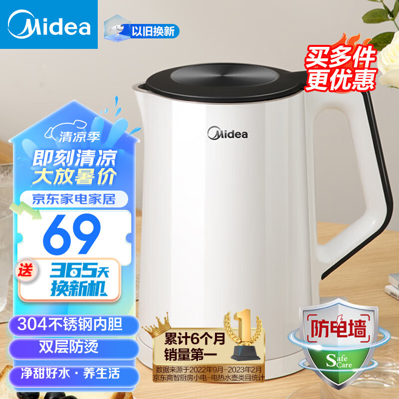 美的(Midea) 电水壶热水壶加大容量 家用烧水壶304不锈钢母婴级 烧水壶双层防烫内胆 【行业Top】304不锈钢内胆 1.5L价格:72.00元!