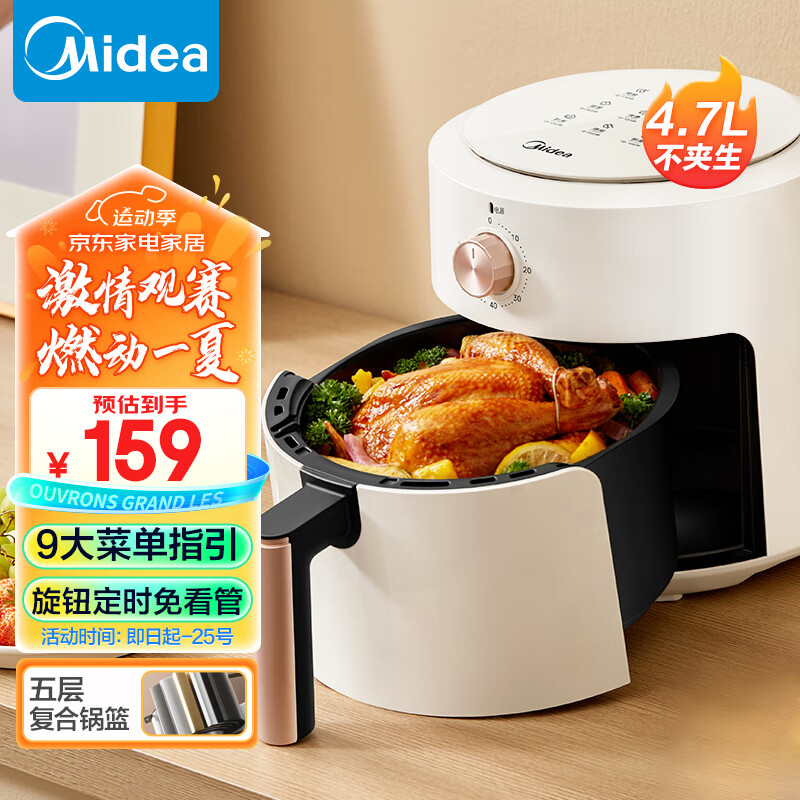 美的(Midea)空气炸锅 家用全自动 烤箱空气炸锅一体机 小型家用 一人 精准控温 不沾易洗 4.7L KZE5014价格:159.00元!