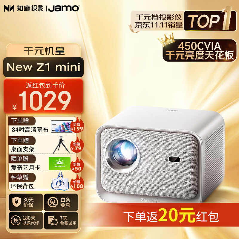 知麻New Z1 mini 2023款 投影仪家用 投影机卧室客厅 智能家庭影院芝麻(450 CVIA流明 全自动校正 全域清晰)价格:1049.00元!
