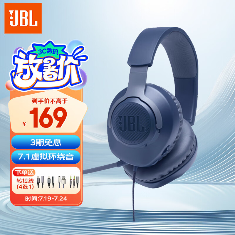 JBL 游戏耳机 头戴式有线电竞耳麦 7.1环绕声电脑吃鸡耳机3.5mm带麦克风监听耳机 Q100 量子风暴 蓝色价格:299.00元!